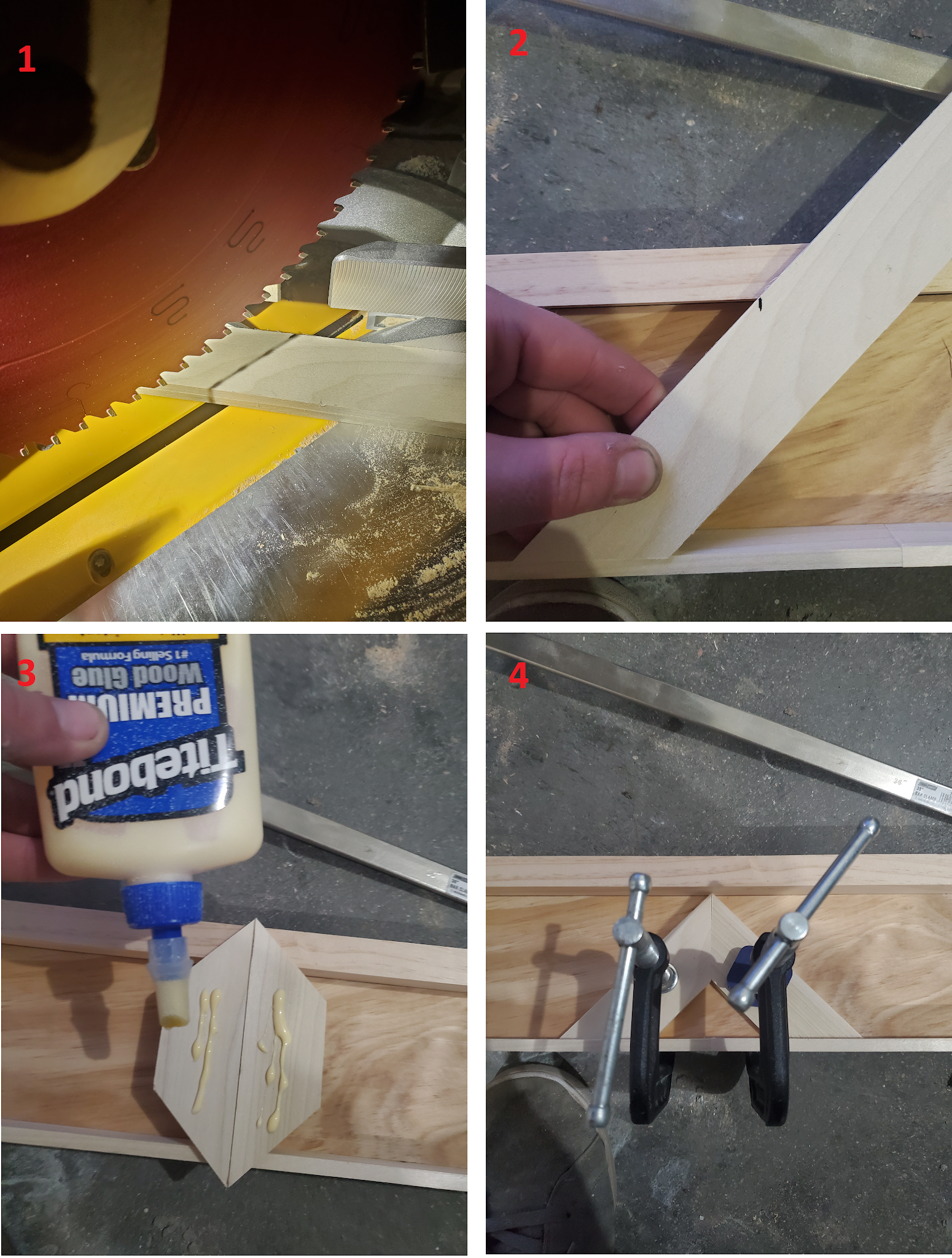 Step 3 (Optional): I wished to add a decorative trim in the middle to break up how long the header was. To make the simple design I took some thin trim wood and cut two 45deg angles twice to create a simple triangle. I then glued and clamped the pieces in the middle.