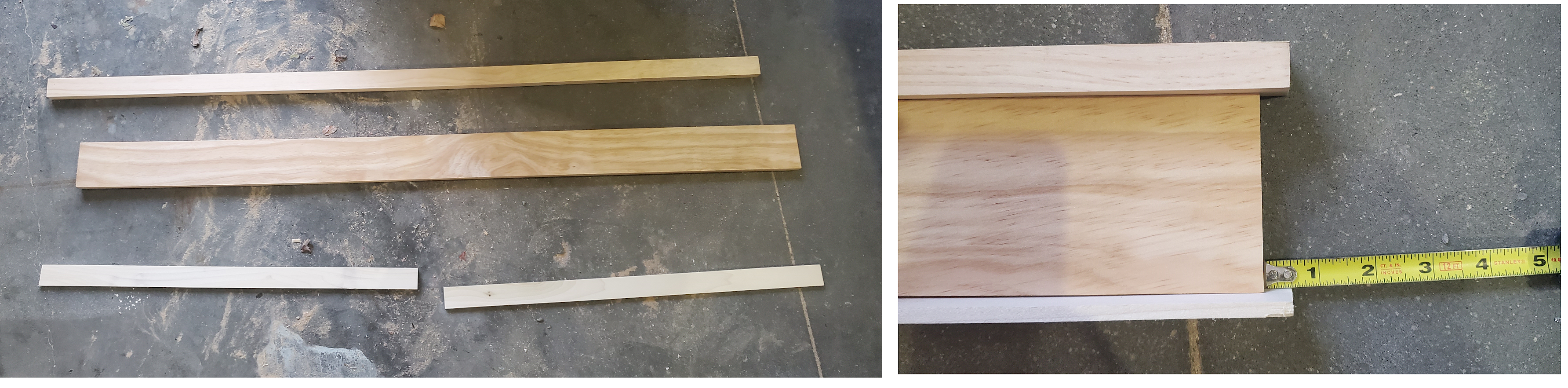 | Left: Pieces laid out, top to bottom (top trim, middle board, bottom trim); Right: 0.5 inch overhang |