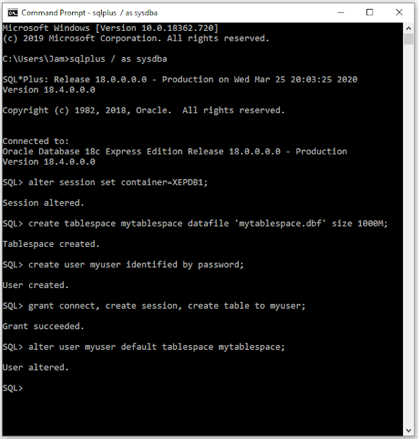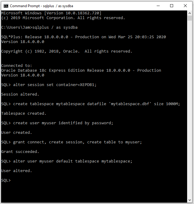 Here is the code shown in the terminal (I forgot to set new tablespace, so I altered the user later):