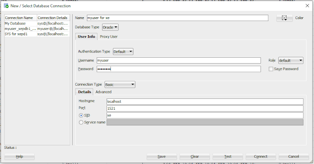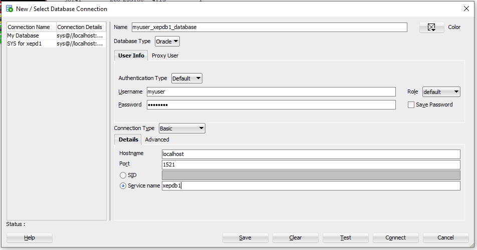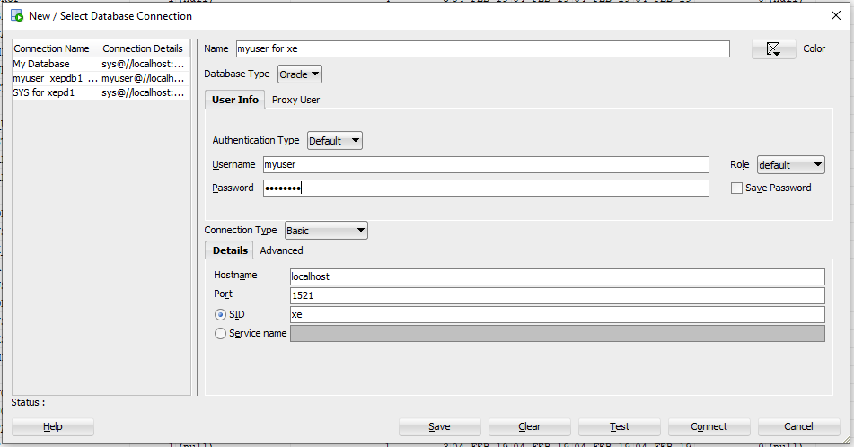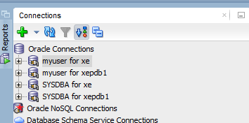 Finally you can see that we have set up a new user/schema called myuser for both the main container and the pluggable database with a separate connection as SYSDBA for admin purposes.