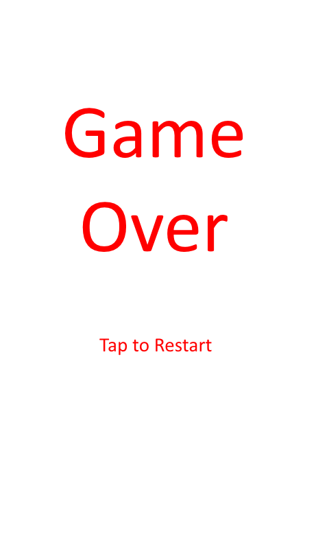 Now to facilitate the game ending, we wish for a Game Over screen to appear and the player will simply need to tap to restart it. Thus I simply just created a gameOver.png file that is 480*800 to overlay on top of the screen: