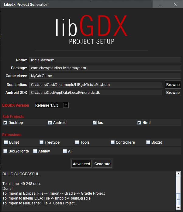 I am however going to skip downloading java, SDK, and libgdx, as I’m assuming you already possess those if you are reading this. If you do not infact do, there are many various tutorials online that could explain it much better than I.