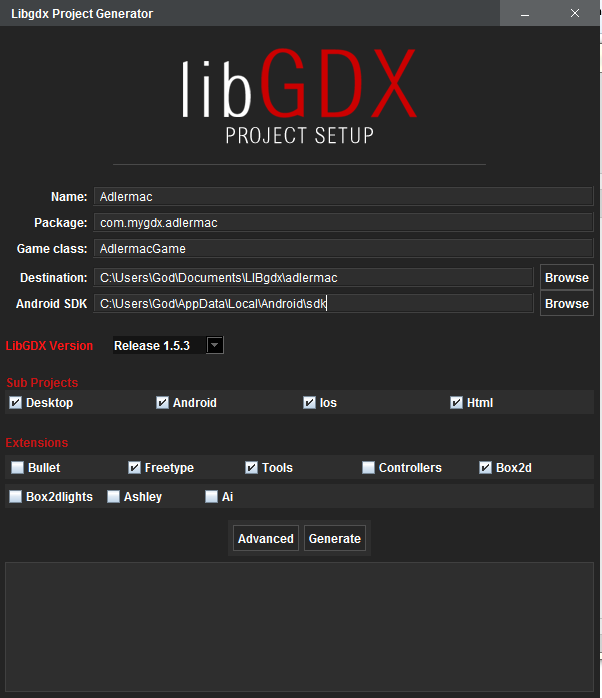 After download libGDX you are prompted with creating your first game file. You may name you file anything that you wish, you do not have to name it “Adlermac”. You then can edit the package class how you wish, but generly you may do something like “com.mywebsiteifihaveone.gamename” and then finally the Game Class is the name of the first executed Java Class. Your destiniation is the save location, and Android SDK is where the SDK was downloaded onto your computer (your location and mine might be different!). The subprojects are by default all selected and you might as well keep them that way, it doesnt hurt to have them. Finally, the extensions are optional you will not need any for any of the soon to be tutorials for a long time. (My project I plan on coding afterwards will just happen to need these.) So in essence, here is a screenshot of setting up your first project: