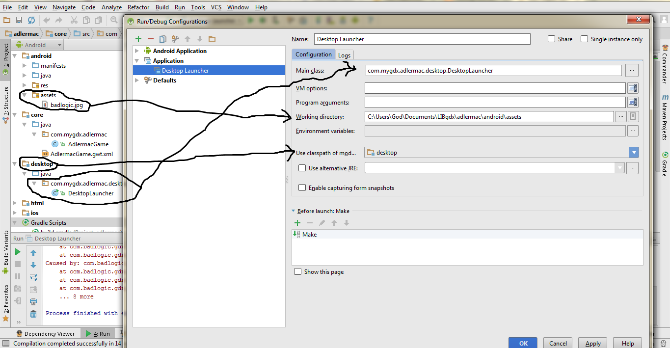 Now we are going to enable the feature that I believe is one of the best reasons for using libGDX, that is testing the game in the desktop mode. To do that, we need to open “Run/Debug Configurations” window -> click the green arrow on the top left and select “application” and edit it as follows: