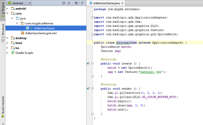 Coming straight from creating your very first libGDX project, your main class and project folder should look like the following: